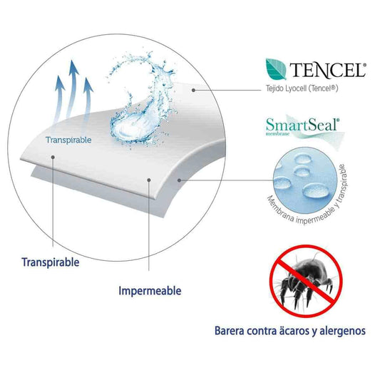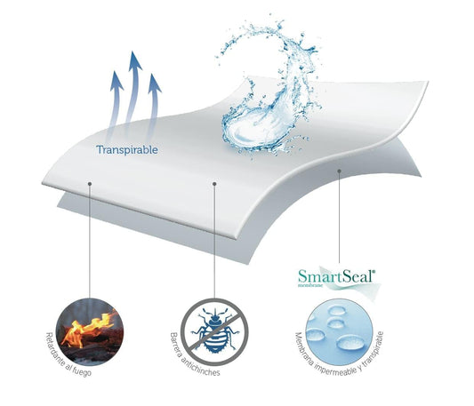 - Il est imperméable , une fine couche de polyuréthane microporeux antiallergique a été appliquée qui empêche le passage de l'eau, mais permet le passage de la vapeur, c'est pourquoi il est respirant et ne provoque pas de transpiration.